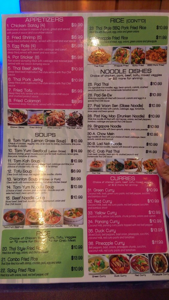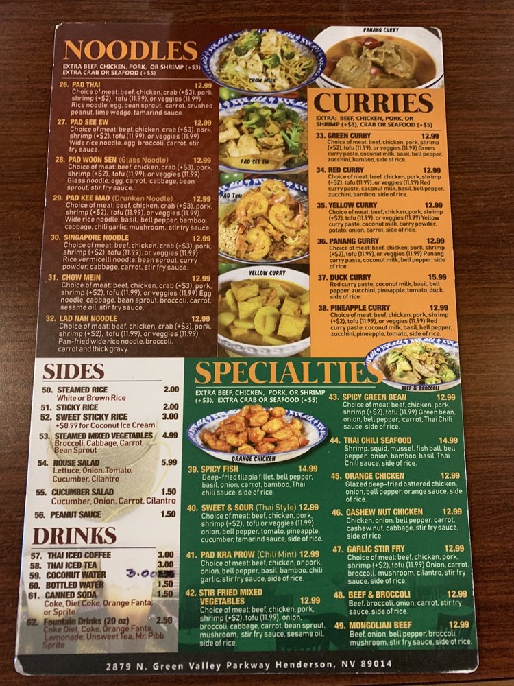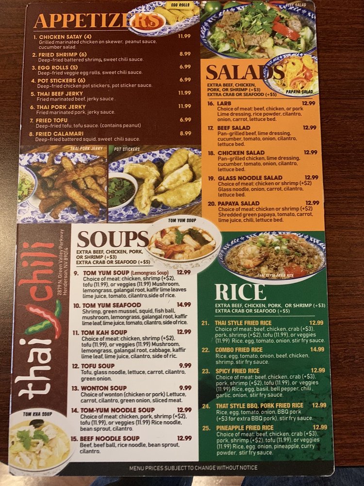 Introducing the menu at Thai Chili, a cozy Thai restaurant in Henderson, NV, where you can enjoy authentic Thai cuisine with a casual vibe. The menu boasts a variety of options, including appetizers like Chicken Satay and Fried Shrimp, flavorful soups like Tom Yum and Tom Kah, and refreshing drinks like Thai Iced Coffee and Coconut Water. Customers rave about the generous portions and bold flavors of dishes like Pad Kee Mao, BBQ Pork Fried Rice, and Orange Chicken. The restaurant offers vegan and vegetarian options, as well as catering services. With positive reviews praising the quality of the food and friendly service, Thai Chili is a hidden gem for those craving delicious Thai cuisine. Don't miss out on trying their signature dishes and make sure to savor every bite during your visit.